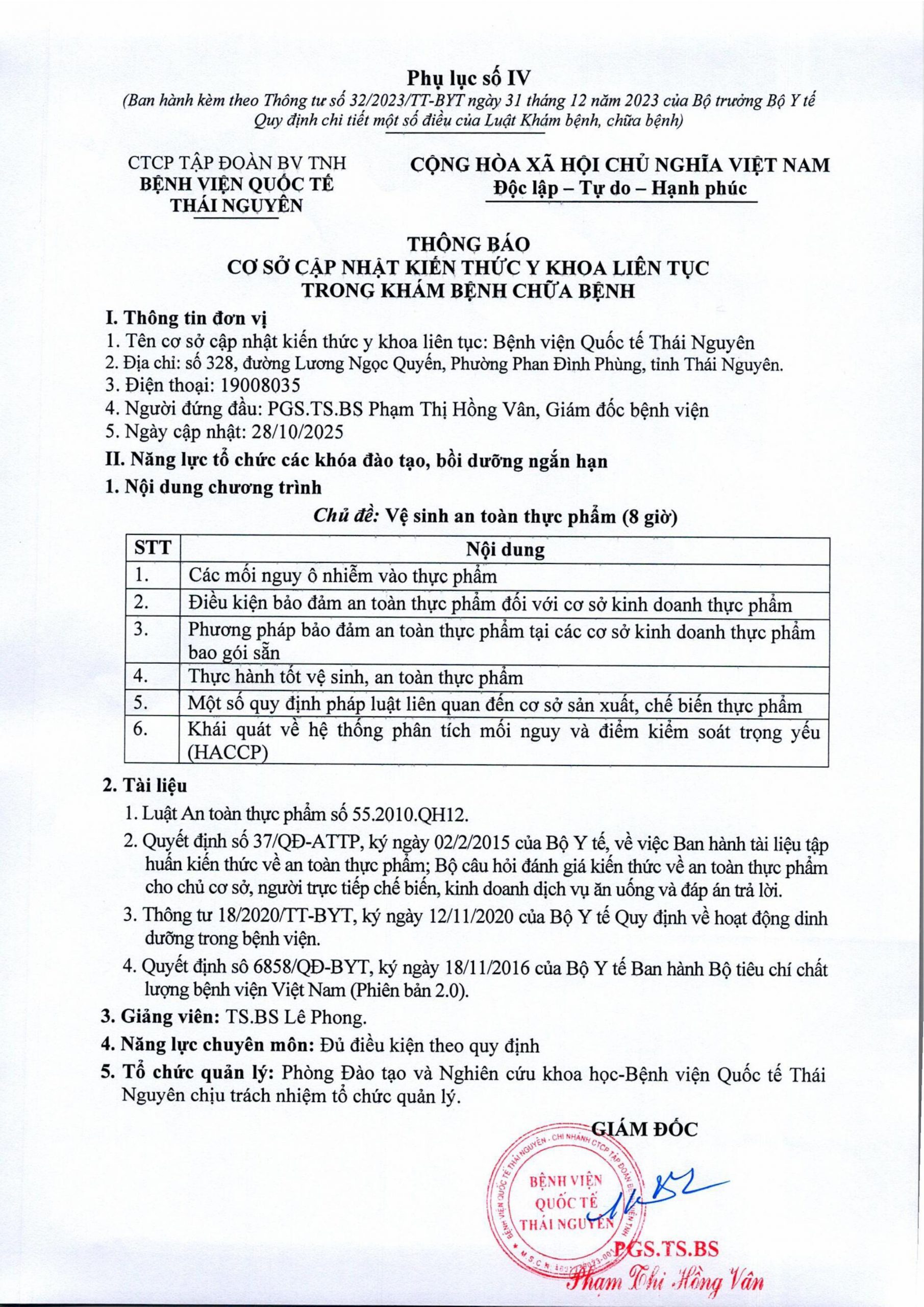 Bệnh viện Quốc tế Thái Nguyên trực thuộc CTCP Tập đoàn Bệnh viện TNH thông báo Cơ sở cập nhập kiến thức y khoa liên tục trong khám bệnh chữa bệnh.